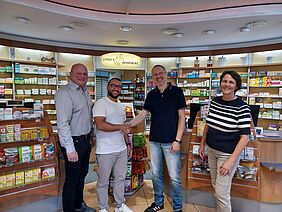 Bild: Georg Seiffert (li.) begrüßt Mazen Ballan (2. v. li.) als neuen Inhaber der Löwenapotheke. Jörg Rössler (2. v. re.) und seine Frau (re.) stehen ihm weiterhin mir Rat und Tat zur Seite.
