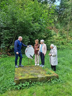 Bürgermeister Georg Seiffert genoss sichtlich die Geschichten der drei Damen und freut sich über das Schild am Storchenstein.