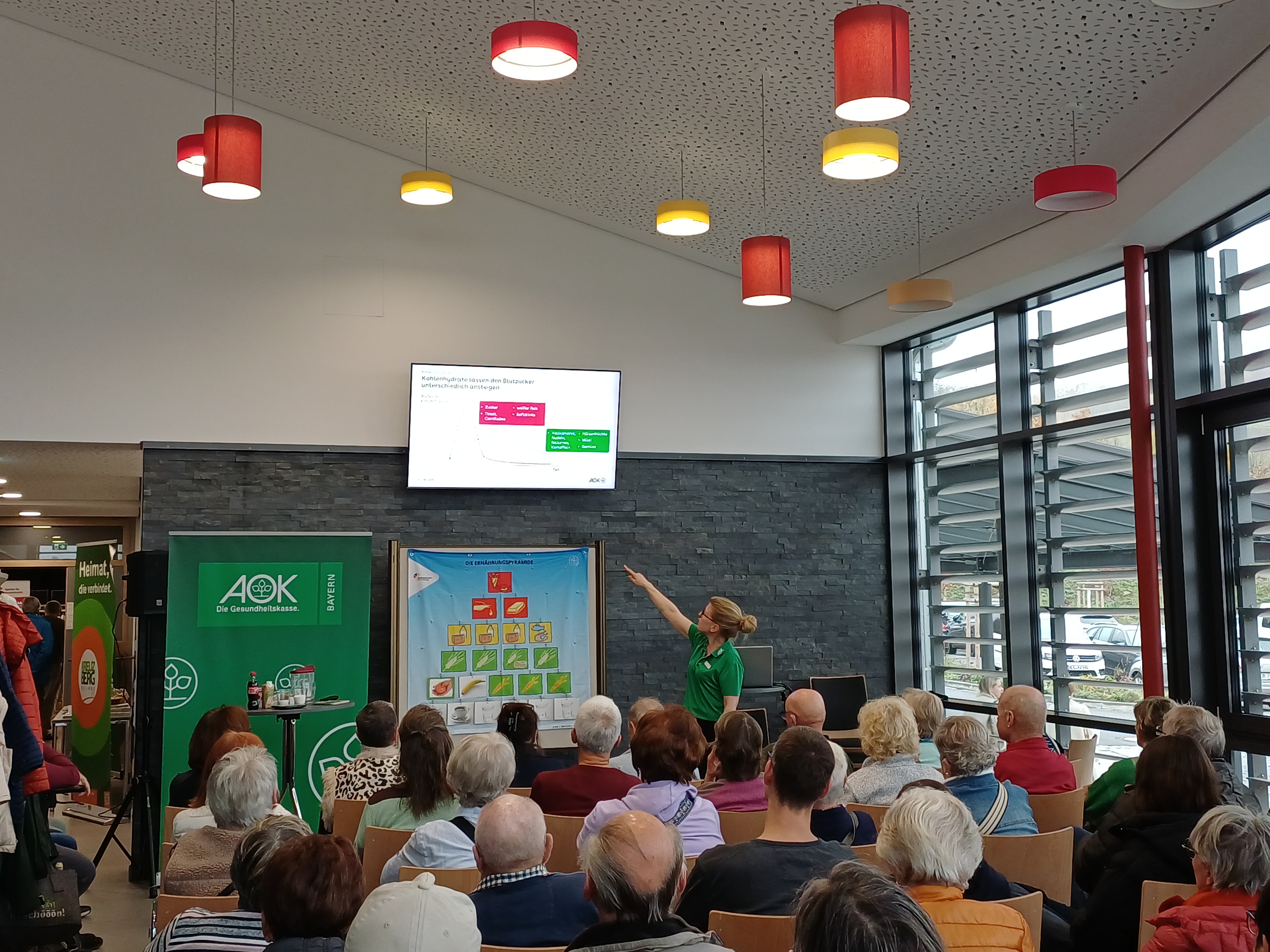 Nach der Eröffnung durch Bürgermeister Georg Seiffert fand im vollbesetzten Foyer ein Vortrag von Martina Edelmann (AOK) über gesunde Ernährung statt; zahlreiche Fragen zeigten großes Interesse. Johannes Kiep (AOK) verdeutlichte in seinen Ausführungen die Bedeutung von körperlicher und geistiger Beweglichkeit und fesselte das Publikum.