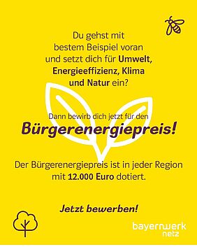 Wer sich für die Energiezukunft vor Ort stark macht, wird belohnt. Seit 13 Jahren rufen die Bayernwerk Netz GmbH und die Regierung von Unterfranken zur Teilnahme am Bürgerenergiepreis auf. „Wir suchen Menschen, die sich mit viel Engagement für das Gelingen der Energiewende einsetzen. Wir zeichnen Vorbilder aus, die eindrucksvoll vermitteln, dass jeder Einzelne vor Ort seinen Beitrag leisten kann“, so Markus Leczycki, der beim Bayernwerk die Partnerschaften mit den bayerischen Kommunen verantwortet. „Zusammen mit der Regierung von Unterfranken als Kooperationspartner starten wir die nächste Runde, bei der insgesamt 12.000 Euro Preisgeld auf Energieheldinnen und Energiehelden aus Unterfranken warten. Prämiert werden beeindruckender Einsatz und Ideenreichtum sowie Projekte, die Ansporn für uns alle auf dem Weg in eine nachhaltige Zukunft sind“