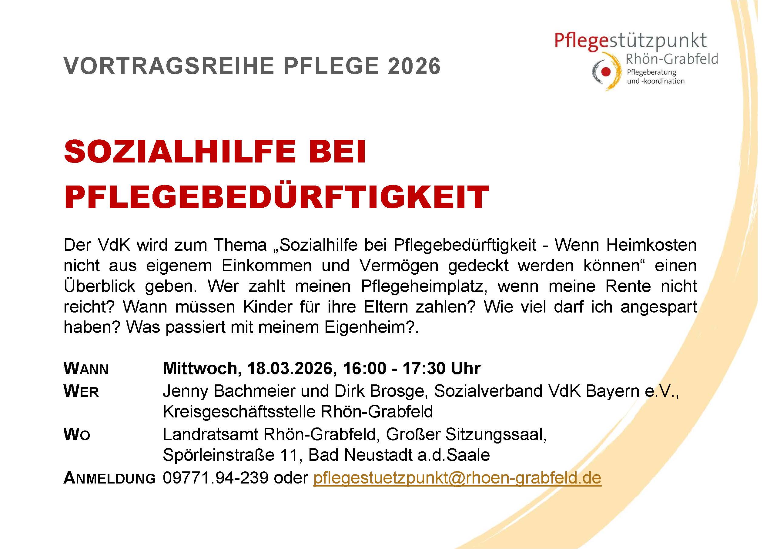 Diese und weitere Fragen werden von Frau Jenny Bachmeier und Herrn Dirk Brosge vom Sozialverband vdk e.V. im Rahmen der Vortragsreihe 2026 des Pflegestützpunktes Rhön-Grabfeld verständlich und praxisnah beantwortet.
